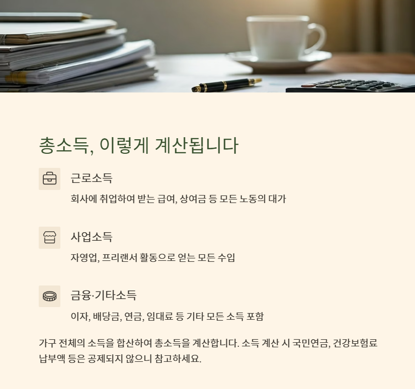'연간 총소득'에는 근로소득(총급여액), 사업소득, 기타소득 등이 모두 합산됩니다(비과세 소득 제외).