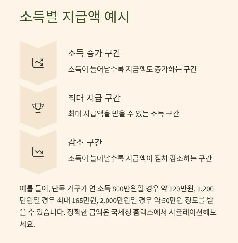 지급액은 소득 구간에 따라 차등 지급되며, 소득이 너무 적거나 많으면 지급액이 줄어들 수 있습니다.