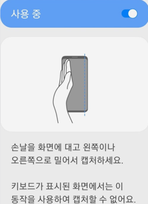 - 설정 > 유용한 기능 > 모션 및 제스처 > '손으로 밀어서 캡처'를 활성화합니다.